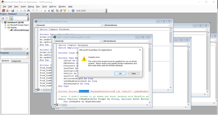 Khi mở ứng dụng có sử dụng đoạn mã trên, sẽ gặp phải thông báo lỗi “The code in this project must be updated for use on 64-bit systems…” như dưới đây: