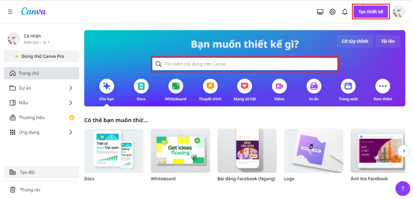 Canva có thư viện mẫu rất đa dạng cho bạn lựa chọn. Muốn chọn mẫu thiết kế nào, nhập nội dung vào phần ô tìm kiếm. Hoặc bạn có thể tự thiết kế bằng cách nhấp chọn Tạo thiết kế.