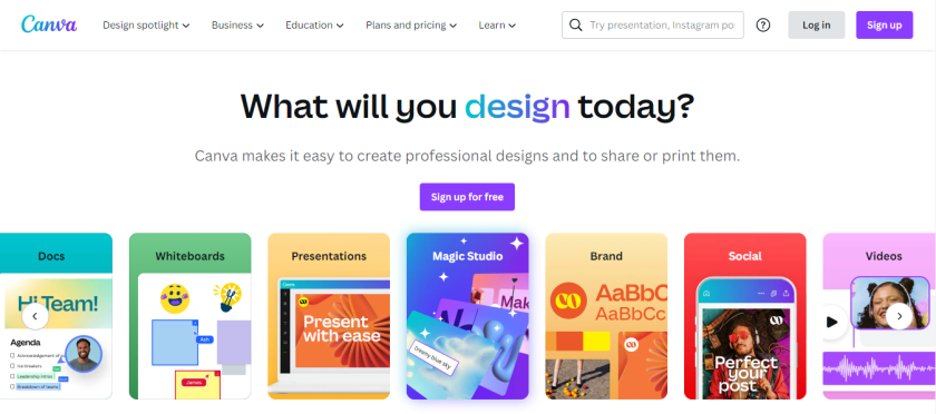 Trên trình duyệt Web, truy cập địa chỉ https://www.canva.com/. Nếu đã có tài khoản, chọn Log in để đăng nhập, nếu chưa có, chọn Sign up để đăng ký:
