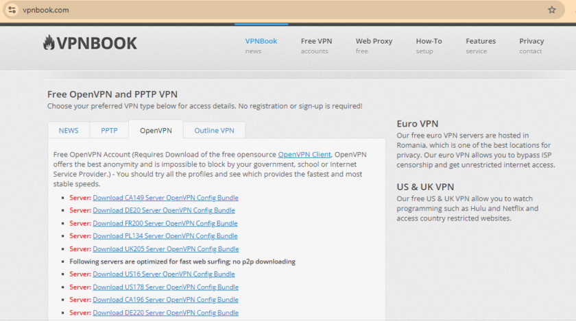 VPNBook cung cấp dịch vụ VPN miễn phí và thông tin kết nối cho nhiều máy chủ. Để sử dụng VPNBook, bạn cần biết cách tải cấu hình và thiết lập OpenVPN, hoặc có thể sử dụng trực tiếp cấu hình Windows với PPTP.